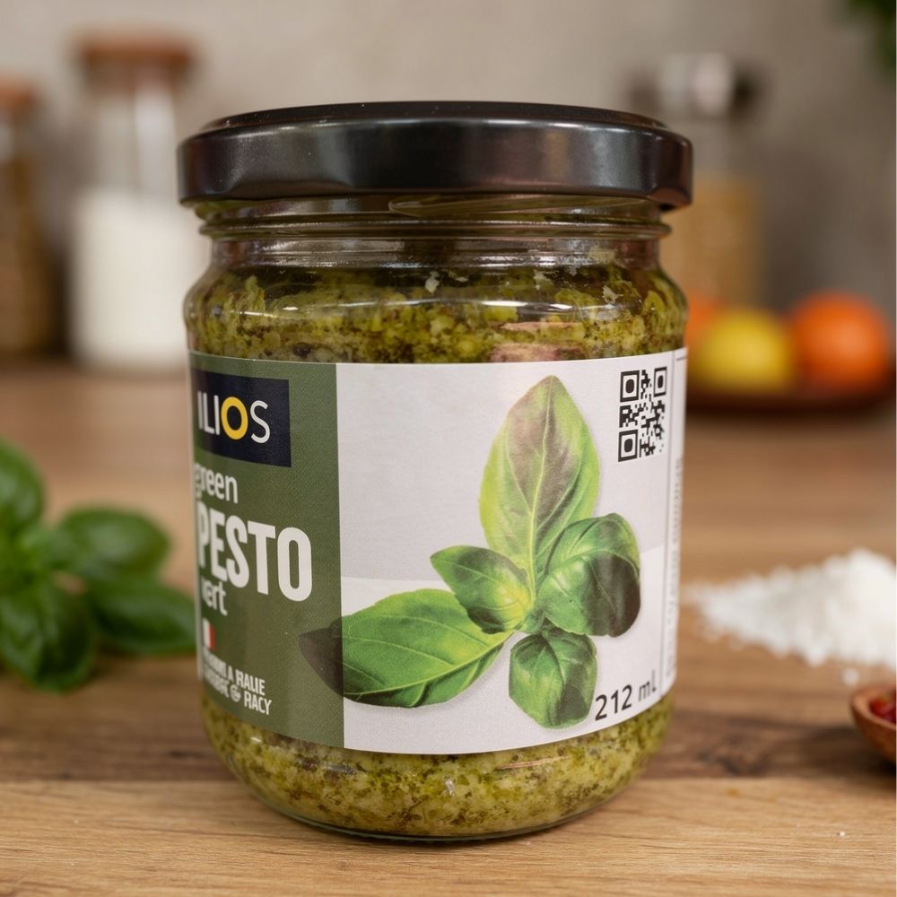 Le pesto vert est une sauce fraîche et aromatique, préparée à partir de basilic parfumé, d’herbes et d’ingrédients soigneusement sélectionnés. Parfait pour les pâtes, les sandwiches, les pizzas ou comme condiment pour rehausser vos plats.