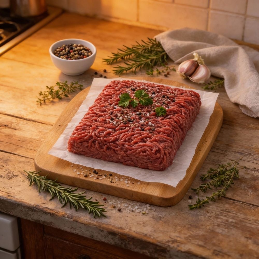 Le wapiti haché est une viande maigre, très faible en gras et en cholestérol, et riche en protéines. Sa chair conserve sa tendreté à la cuisson avec peu de perte, idéale pour les sauces, sautés, boulettes ou recettes nécessitant une viande hachée savoureuse et saine.